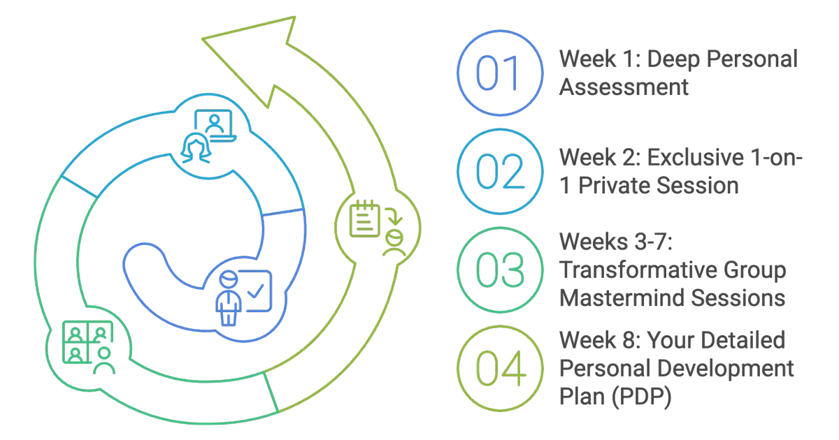 GROUP MASTERMIND SESSIONS: Five powerful 60-minute group coaching sessions with peer support and accountability. Real Value: $597 USD